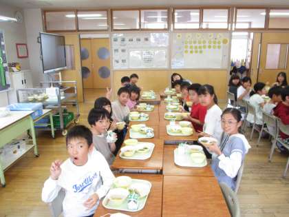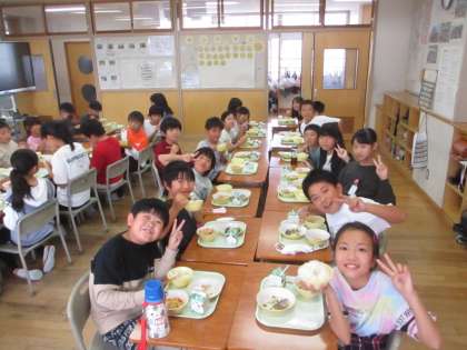 今日は、3年生と5年生で縦割り給食交流会を行いました。最初は緊張していたようでしたが、優しい5年生の子供たちが声をかけてくれたおかげで、少しずつ笑顔も見られ楽しく食べる様子が見られました。
