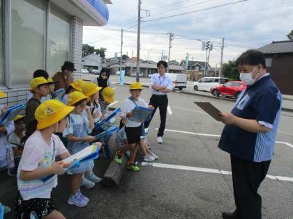 先日の町探検の様子です。ローソン富山ひらき店さんにも伺って、インタビューさせていただきました。外でお話を聞いた後、店内を見せていただきました。いつもは入ることのできない場所にも入れていただき、子供たちは大満足でした。