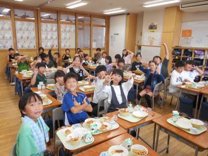 今日の給食は、みんなが大好きな焼きそばでした。「おかわり」と笑顔で言いに来る子供たちでした。