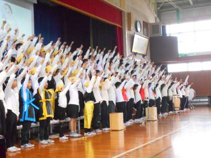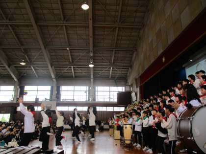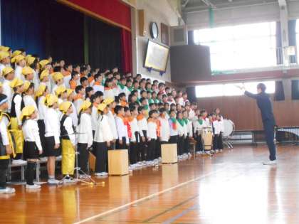 全体での歌の様子です。これまでの練習の成果を発揮しようと、一生懸命に歌ったり踊ったりしていました。終わったあとに「心をこめて歌ったよ」「笑顔でいれたよ」「緊張したけど楽しかった」と話す子供たちの笑顔が輝いていました。