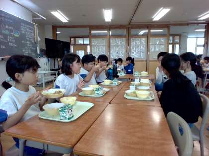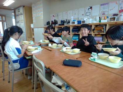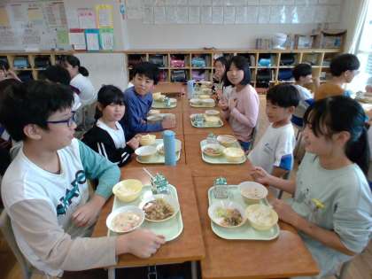 6年3組では、4年3組と交流給食をしました。6年生の子供たちは、4年生との会話がなるべく弾むように、話す内容やゲームを考え、交流給食を楽しみました。