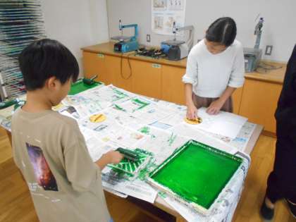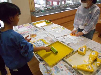 図工の時間では、多色刷りに挑戦しています。今日は、実際に彫った板にインクを塗り、刷る作業を行いました。自分が納得いく作品に仕上げようと、丁寧に作業を進めていました。