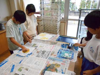 図工の時間では、多色刷りに挑戦しています。今日は、実際に彫った板にインクを塗り、刷る作業を行いました。自分が納得いく作品に仕上げようと、丁寧に作業を進めていました。