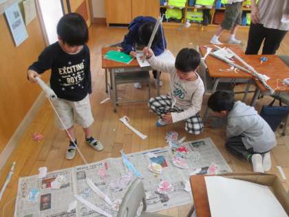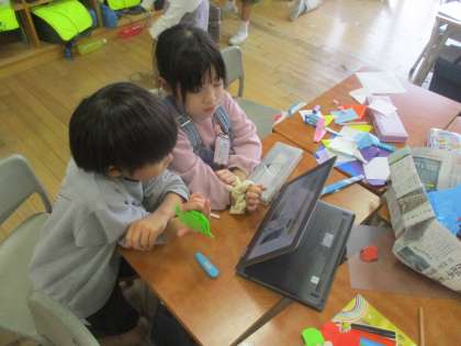 生活科の学習では、年長さんとの交流会に向けて準備を進めています。年長さんが喜ぶような工夫を考えていました。