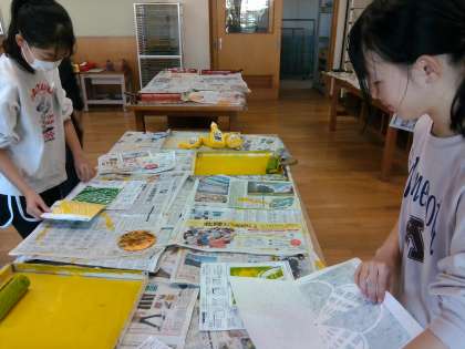 木版画が完成しました。1つの模様を4つつなげて、作品ができました。イメージ通りにできた作品を見て、喜びを感じていました。