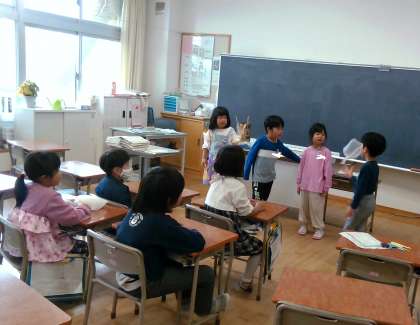 「みんなわくわく!ようこそふじのきしょうがっこうへ」の学習では、こども園との交流会に向けて準備を進めています。年長児役と案内役に分かれてグループごとに活動しました。「ちゃんと手を繋いであげたほうがいいよ」「説明が上手だね」等と、互いのグループのよいところや改善点を伝え合いました。