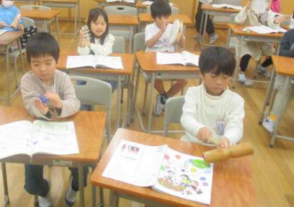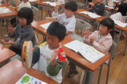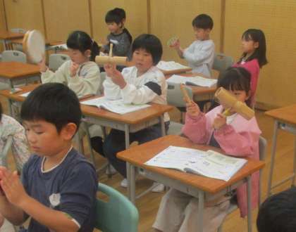 今日は、4人の組になって4つの楽器を順番に回しながら、音楽に合わせて鳴らしました。楽器の音やリズムの違いを感じながら、工夫して演奏していました。