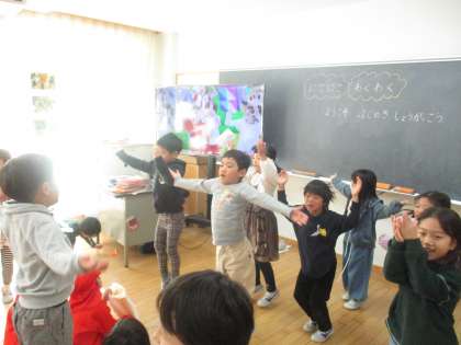 交流会では、学習発表会で行った歌やダンスを見てもらいました。また、年長児にやさしく声をかけ、手をつないで一緒に歩いていました。