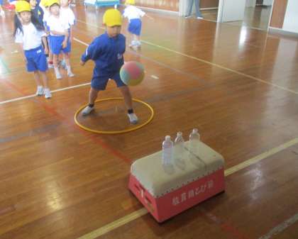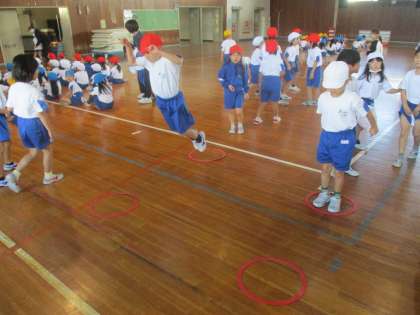 友達と声をかけ合いながら、跳び方や投げ方を考えていました。また、レベルアップできるように何回も繰り返し活動していました。