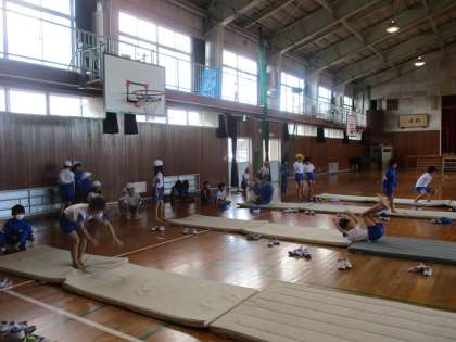 体育科では、マット運動の学習をしました。前転では、足をとじてスムーズに回転し、手を使わずに起き上がる練習をしたりしました。倒立は、今日が初めてだったので、補助倒立をしたり、できるようになったら壁倒立をしたりしました。子供たちは、少しずつできなかったことができるようになっていくことがうれしく、意欲的に取り組んでいました。