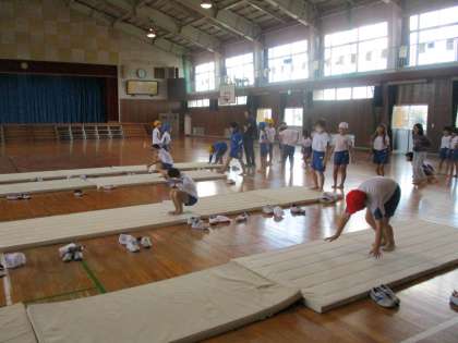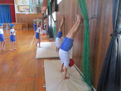 体育科では、マット運動の学習をしました。前転では、足をとじてスムーズに回転し、手を使わずに起き上がる練習をしたりしました。倒立は、今日が初めてだったので、補助倒立をしたり、できるようになったら壁倒立をしたりしました。子供たちは、少しずつできなかったことができるようになっていくことがうれしく、意欲的に取り組んでいました。