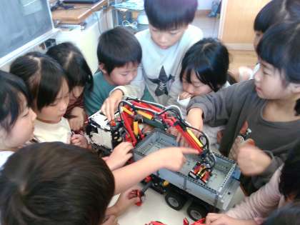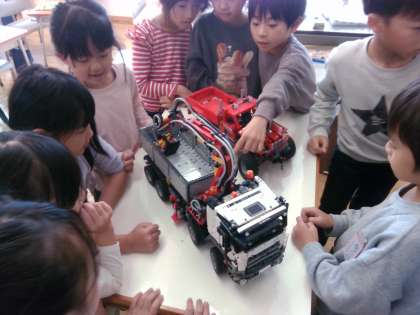 国語科では「じどう車くらべ」の学習をしています。今日は、ブロックでできたトラックを使って、文章に書いてある「しごと」や「つくり」について確認しました。子供たちは、実際に触ったり、動かしたりすることができて、大興奮でした。