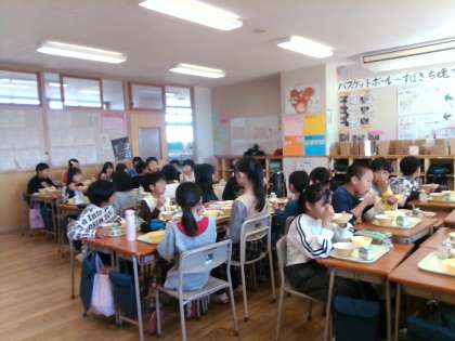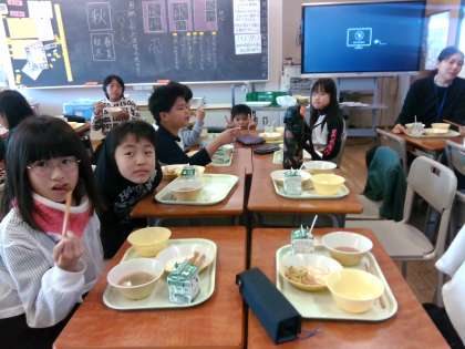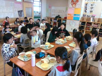 藤ノ木小学校では、違う学年との仲を深めるために縦割り交流給食を行っています。5年生は3年生と交流を行いました。子供たちは、初めて話す相手に緊張しながらも、自己紹介をしたり学習内容を教えたりして、和やかな時間を過ごしました。