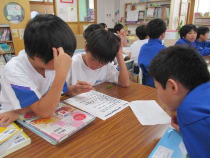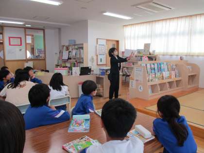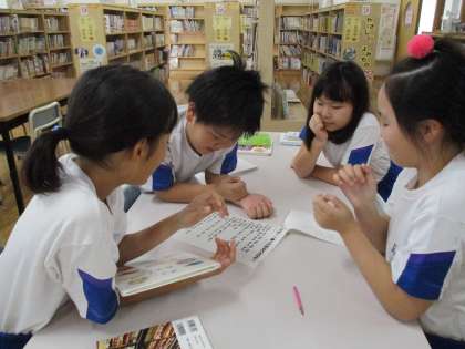 ゲームやクイズを取り入れながら読書の楽しさを体験する「アニマシオン」を司書の横山先生にしていただきました。今日のテーマは「音」。視覚を失った登場人物と小学生たちの温かいやり取りを描いた「バスがきましたよ」、様々な食べ物から出る音を紹介した「おいしいおと」の2冊を読んでもらいました。「おいしいおと」を聞いたあと、横山先生からクイズを出してもらい、班のみんなで楽しみました。