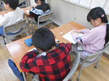 書写の学習では、点の方向に注目して文字を書きました。子供たちは、毎時間集中して、整った文字が書けるように練習をしています。