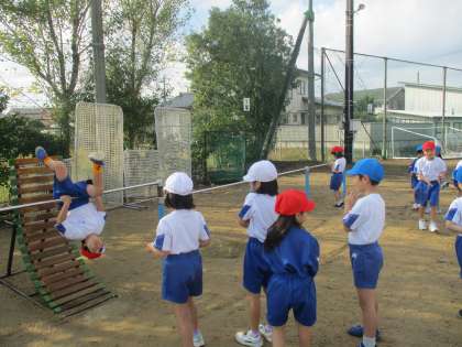 グラウンドで、鉄棒やゴム跳びに取り組みました。活動を続ける中で「もっとうまく回りたい」「もっと高く跳びたい」などといった課題をもち、どうやったらレベルアップした動きになるのか考えたり、友達と相談したりして繰り返し練習していました。