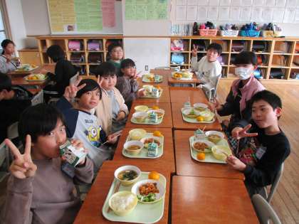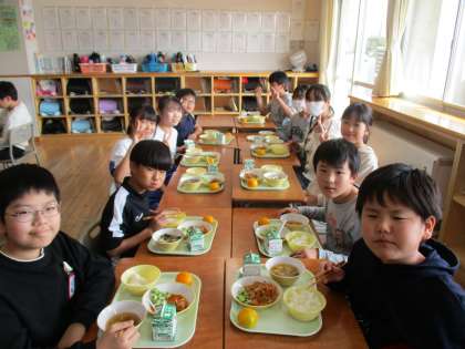今日は、6年1組と4年1組の交流給食が行われました。初めて顔を合わせる人もおり、緊張しながら会食がスタートしましたが、6年生が積極的に話しかけてくれ、場を和ませてくれました。クイズを出してもらったり、楽しい話をしてもらったりして4年生は大喜びでした。