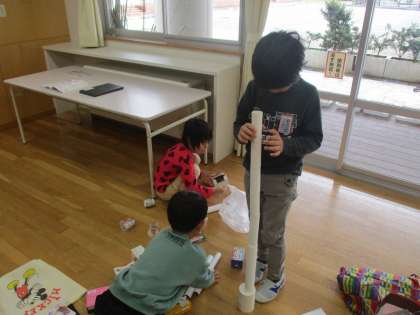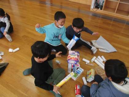 算数科の学習では、集めて持ってきた箱や缶を使って、教科書を参考に物を積み上げる活動を行いました。子供たちは、つくりたい形を想像したり、友達と一緒に考えたりして取り組んでいました。また、積み上げた高さを競って楽しむ子供もいました。