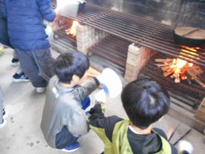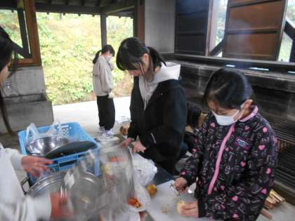 友達と協力して、野菜を切ったり火を起こしたりしてカレーライスを作っています。