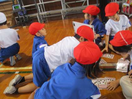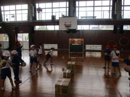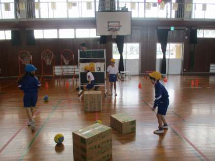 ボールを投げて箱を押し合うゲームに取り組んでいます。団の仲間と話し合って作戦を決め、相手よりもたくさんの箱を陣地に入れられるように一生懸命取り組んでいました。
