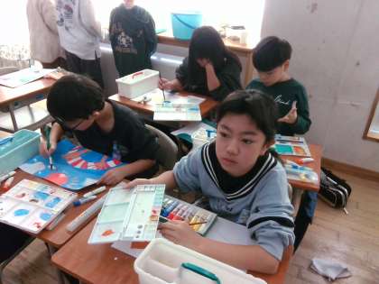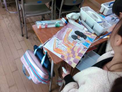 図画工作科では、4年生になって「うれしい」「楽しい」などの気持ちを感じた場面を絵に表しています。今日は水彩で色塗りをしました。色の混ぜ方を工夫して、自分が描きたい絵に近づけられるよう頑張っていました。