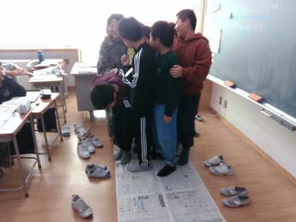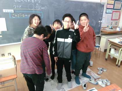 新聞紙の大きさを変えたり、上に乗る人数を変えたりしながら混み具合を体験しました。