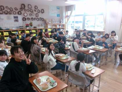 給食の時間、5年生と給食交流会をしました。赤団、黄団は5年生の教室へ、白団、青団は1年生の教室て食べました。いつもと違う雰囲気を楽しみながら食べることができました。