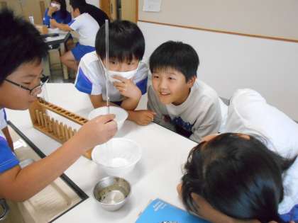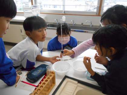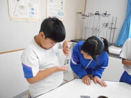 理科の学習では、空気の体積を変えるにはどうしたらよいか考えています。この日の実験では、空気をあたためたり冷やしたりして、空気の体積がどのように変化するのか観察しました。