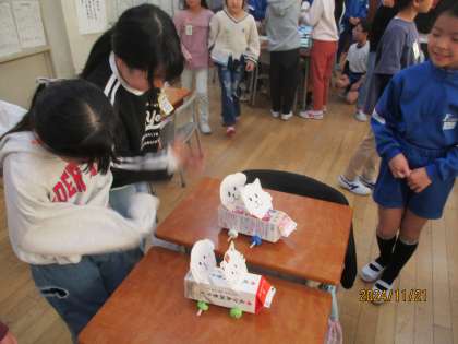 生活科の学習でつくっているおもちゃを学年みんなで遊びました。他のクラスのおもちゃを見て、まねしたいところや自分がつくってきたおもちゃの改善点等が見付かりました。来週からいよいよ1年生を招待してのおもちゃランドがあるので、もっとよいおもちゃにしていきます。