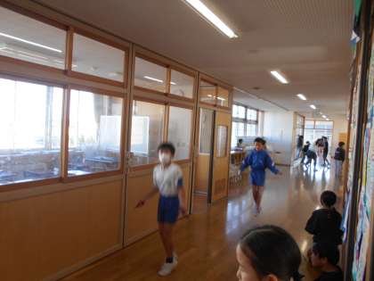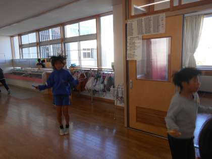 縄跳び大会でよい記録がだせるように、マイタイムや休み時間に縄跳びの練習に励んでいます。「今日はたくさん跳べたよ」と笑顔で回数を記録する友達につられて、大会に参加しない子供たちも加わり、みんなで自己ベストを更新しようと取り組んでいます。