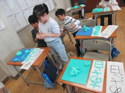 書初めで書く文字の形を正確に捉えるために粘土で文字を作りました。子供たちは、手本をよく見て同じ形になるようにがんばっていました。文字ができた後は、友達と見合ってアドバイスをし合いました。