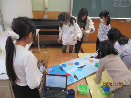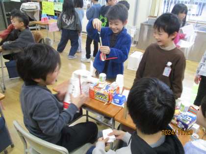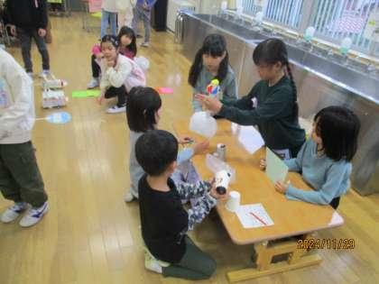 おもちゃランドに1年生を招待しました。1年生が来る直前までは、遊び方をちゃんと教えてあげられるか不安な様子でしたが、楽しそうに遊ぶ1年生を見て「がんばってつくってきてよかった」と感じていました。