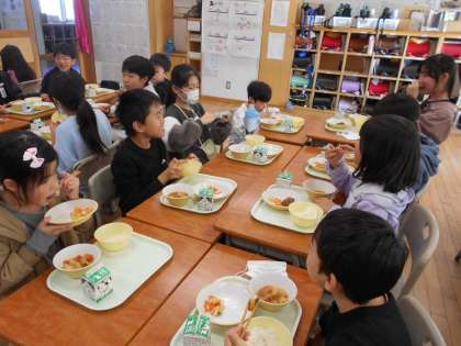先日、1年生と交流給食をしました。1年生は緊張した様子でしたが、5年生が「好きな食べ物は?」「何の習い事をしている?」などと、積極的に質問し、コミュニケーションをとりながら楽しい時間を過ごしていました。