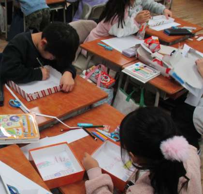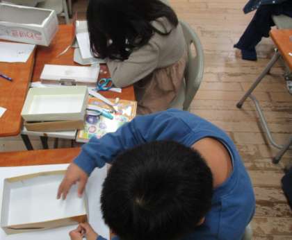 集めた箱を使って、すごろくをつくりました。楽しく遊べるようにマス目の内容を一生懸命考えたり、サイコロや駒を工夫してつくったりしました。