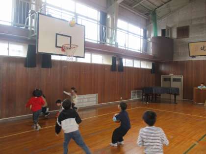 体育館で、ボールを使って遊ぶ子供たちがたくさんいました。体育科で学習している「なげておせおせゲーム」を思い出し、色々な投げ方を試しながらゴールに向かってボールを投げていました。