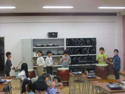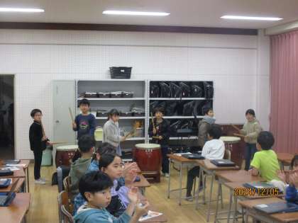 自分たちで考えたリズムを、和太鼓で打ちました。子供たちは、初めての体験を楽しんでいました。