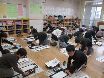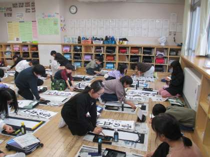 机上での練習から、床での練習にうつり、体重をかけながら力強く揮毫する姿が見られるようになりました。今日は、平仮名の「折れ」に気を付けながら書きました。
