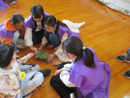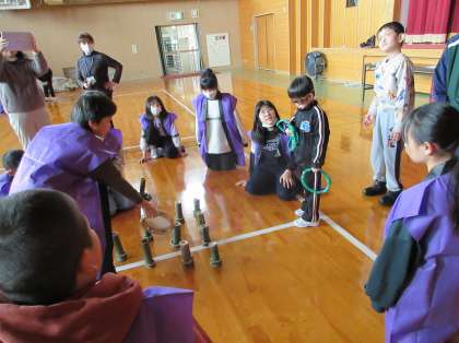 今日は最後に「出張藤ノ木仲間祭り」を行いました。竹の楽器体験、輪投げ、息を吹きかけてピンポン玉を転がすゲームの3つの活動をしました。どれも楽しんでもらえたようで子供たちもとても嬉しそうでした。