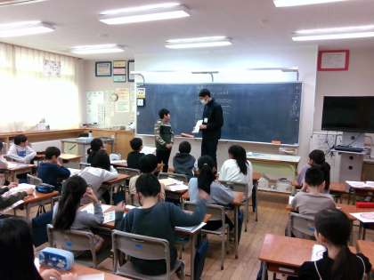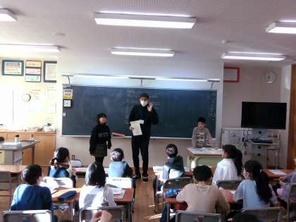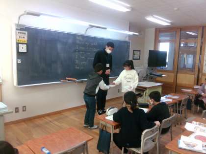 前回の学習では、ペアでパフェとピザを英語で注文し合いました。今日はそれらをお互いに渡し合う活動をしました。友達に描いてもらったパフェとピザを貰い、喜んでいる様子が見られました。