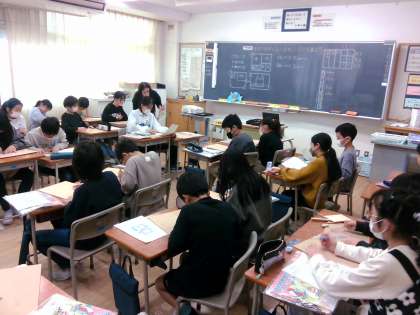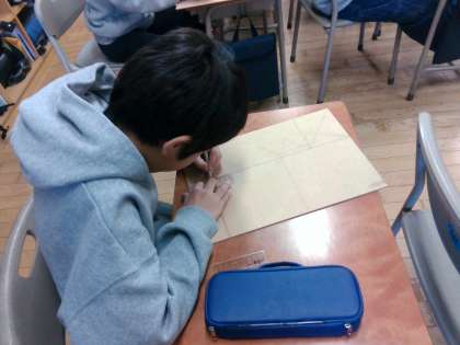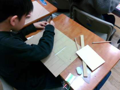 木の板を使って、自分だけのオリジナル掲示板を作ります。設計図を基に、切るパーツを板に描いています。3学期、ノコギリで切ることを楽しみにしています。