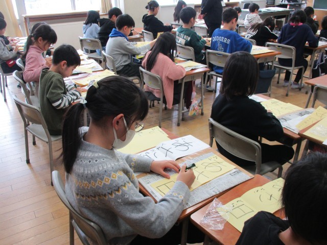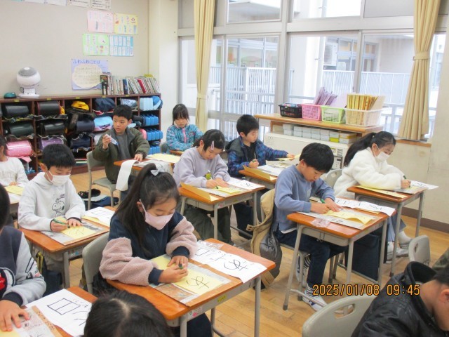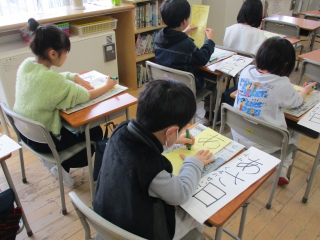 どの子も自信をもって「あさ日」を書きました。冬休み前の字と比べると、とても上手になっています。子供たちは、廊下に貼られた作品を見合いながら、「ここが上手に書けた」「ここが難しかった」と話していました。