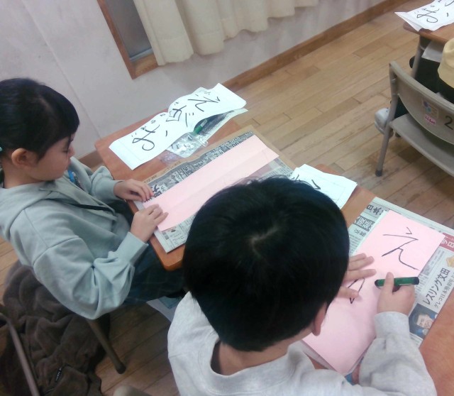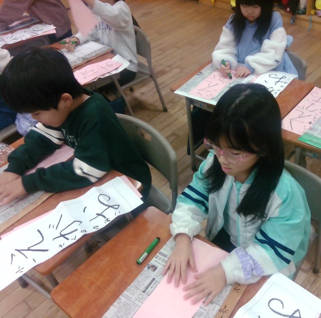 書初め大会の本番でした。「えがお」で1年間過ごすことができるように、今までの練習を生かして一文字ずつ丁寧に書いていました。