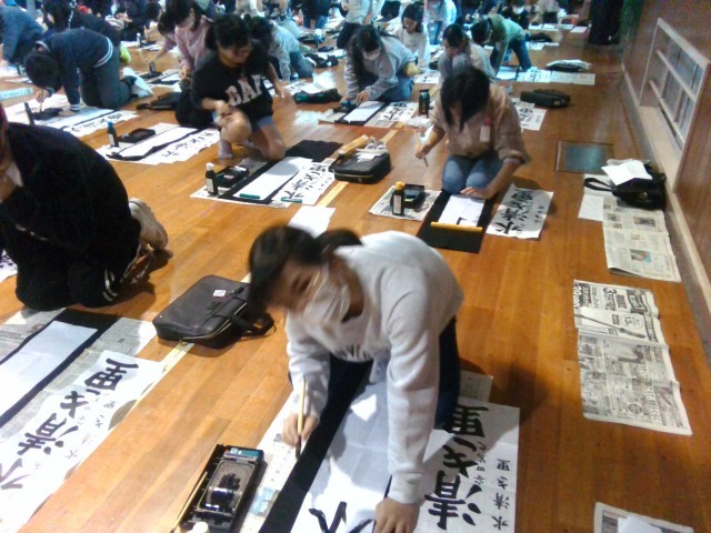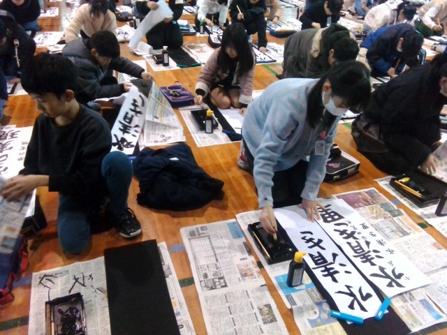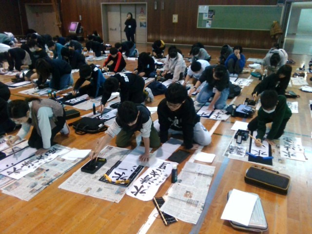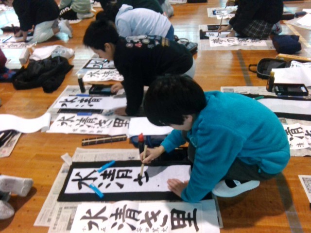 始業式に書初大会を行いました。学校や冬休みに練習してきたことを生かして、真剣に取り組む姿が見られました。