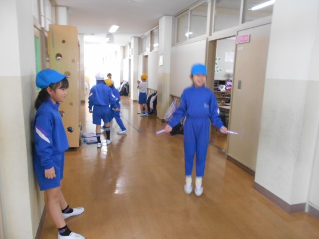 体育科の学習では、縄跳びの練習をしています。気温は肌寒いですが、子供たちは一生懸命練習し、汗だくです。いろいろな技に挑戦している姿が、素敵です。