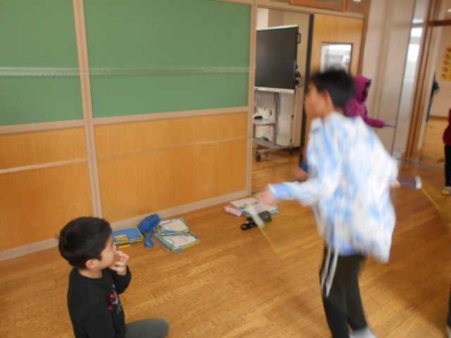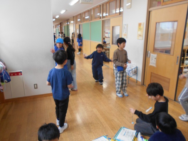 休み時間に、二人一組でなわとびをしている様子です。新しい技ができるようになりたいと、友達に確認してもらいながら練習に励んでいました。