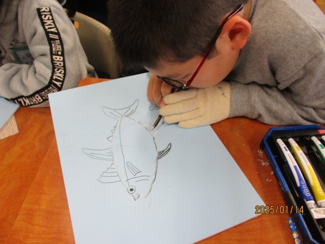 版画の「彫り」を始めました。けがをしないよう、注意しながら熱心に彫り進めています。