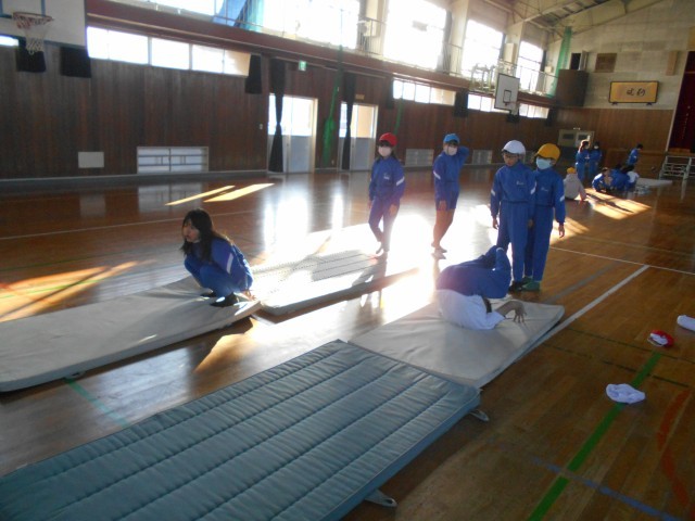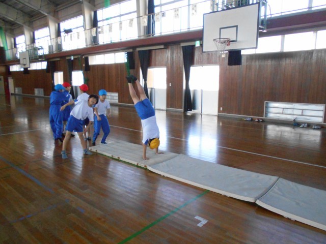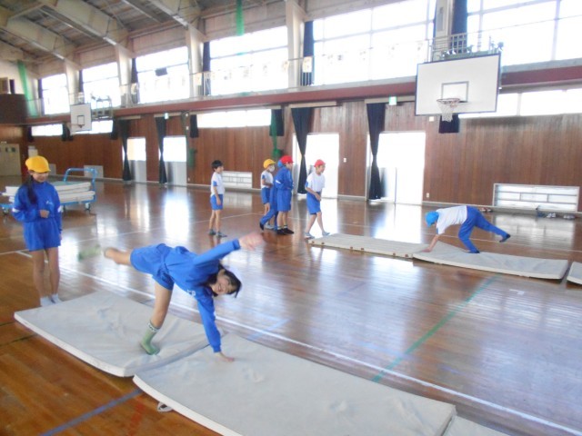 体育の学習では、マット運動に取り組んでいます。今日は組み合わせ技にチャレンジしました。「前転→開脚前転」「倒立前転→前転」など、得意な技を取り入れたり、流れがスムーズになるように工夫したりしながら活動に取り組みました。