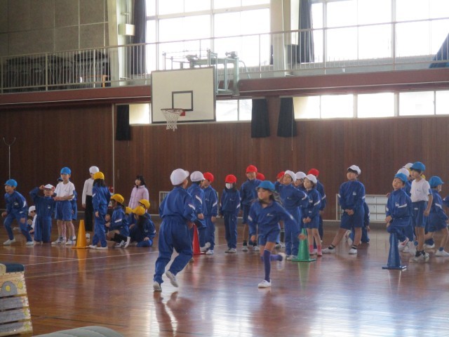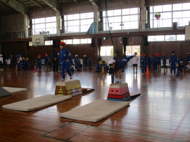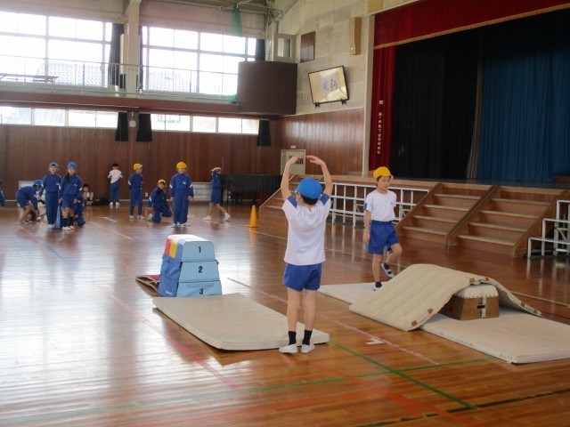 跳び箱に跳び乗ったり、またぎ越したりして、跳び箱を使って運動しました。着地のポーズまで美しく決められるように、気を付けていました。