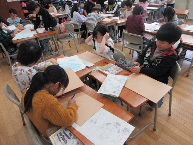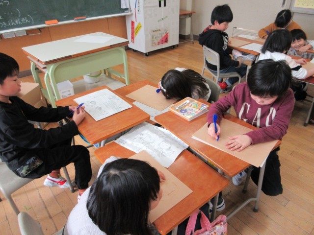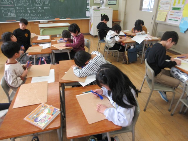 図画工作科「たのしく うつして」では、スチレン版画をします。下絵を描いたあと、ヘラや型押しをつかって線や模様を描きました。どんな仕上がりになるかを考えながら楽しく取り組んでいました。