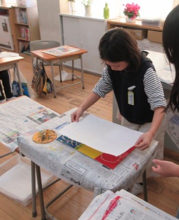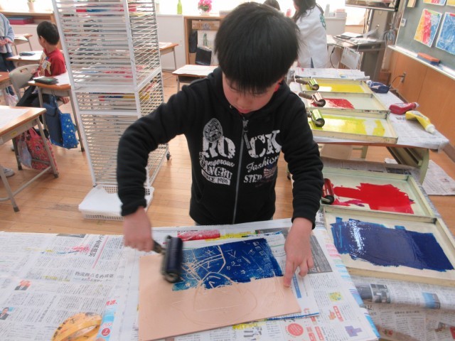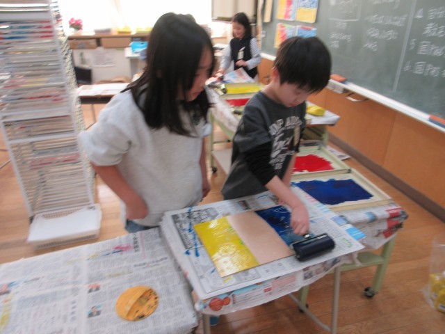 図画工作科「たのしくうつして」では、ヘラや型押しをした板にインクをつけて刷りました。色の選択や付け方を自分で考え、それぞれ満足のいく作品に仕上げていました。